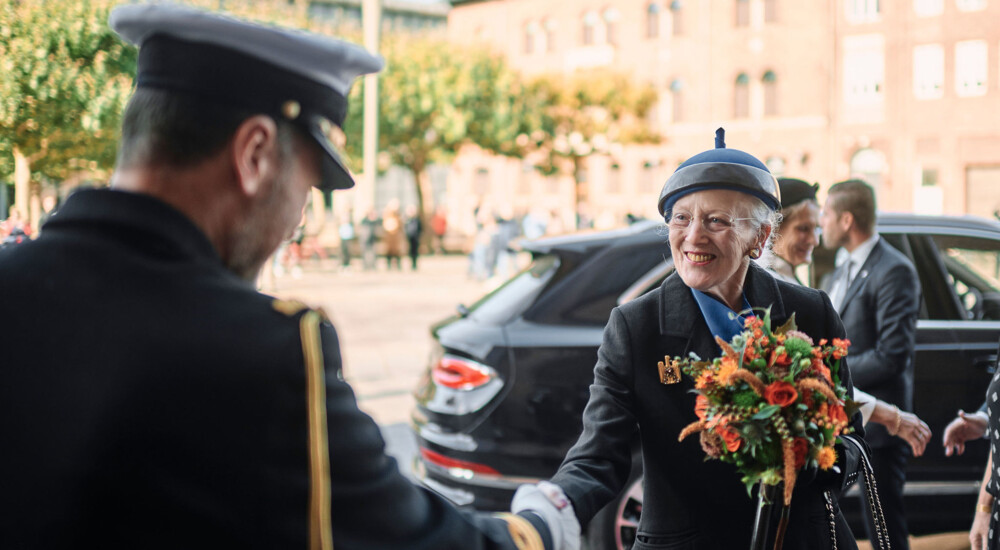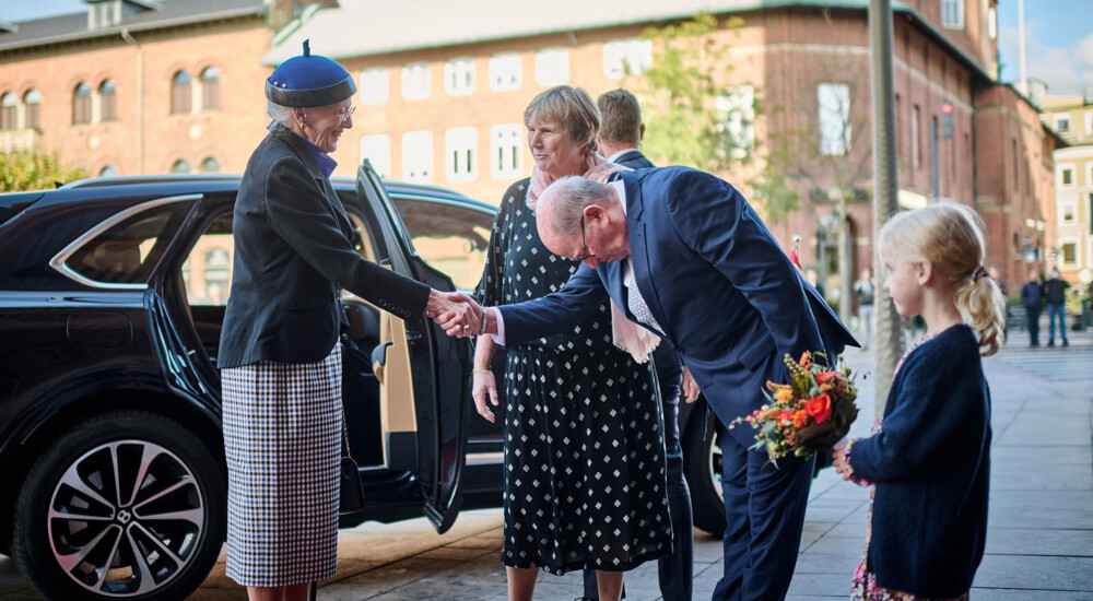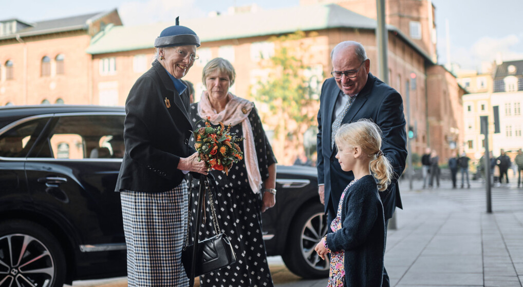 H.M Dronning Margrethe ankommer til kirken og modtages af blomsterpigen samt menighedsrådsformand Eva Haue og kirkeværge Mogens Hesselvig