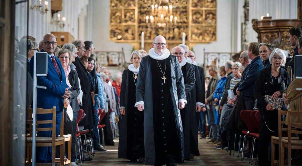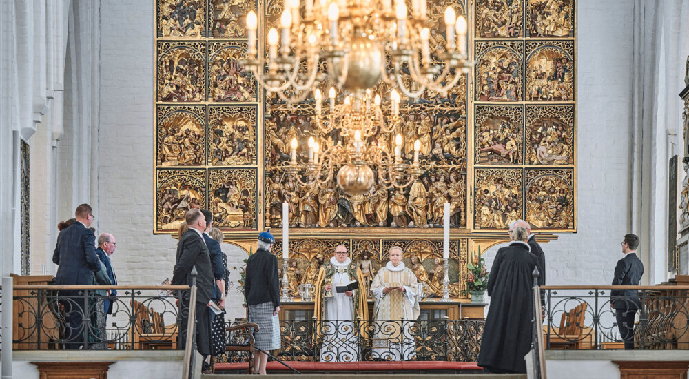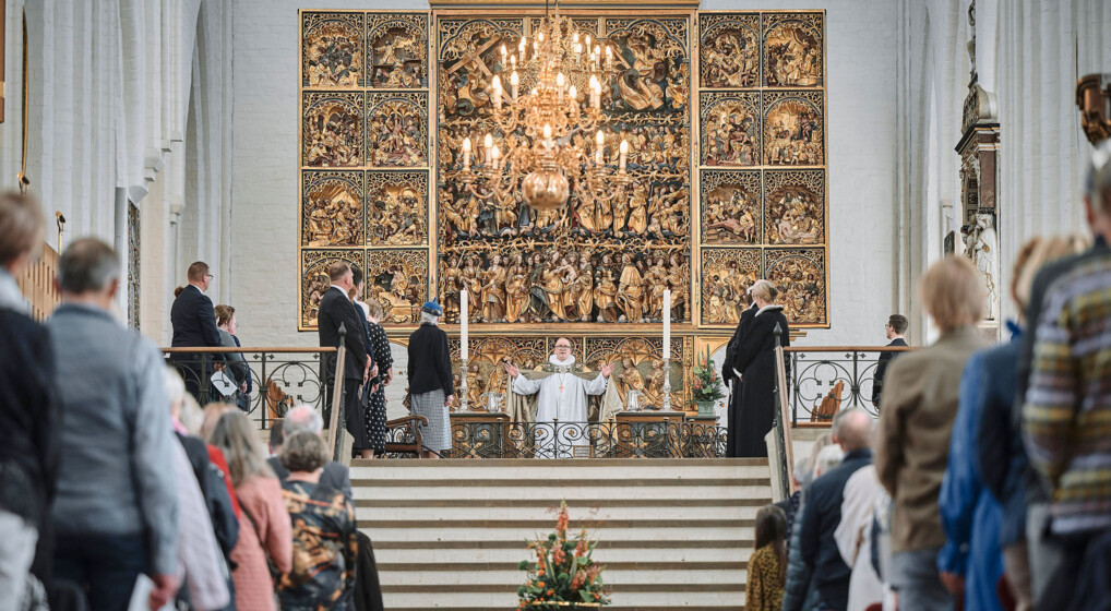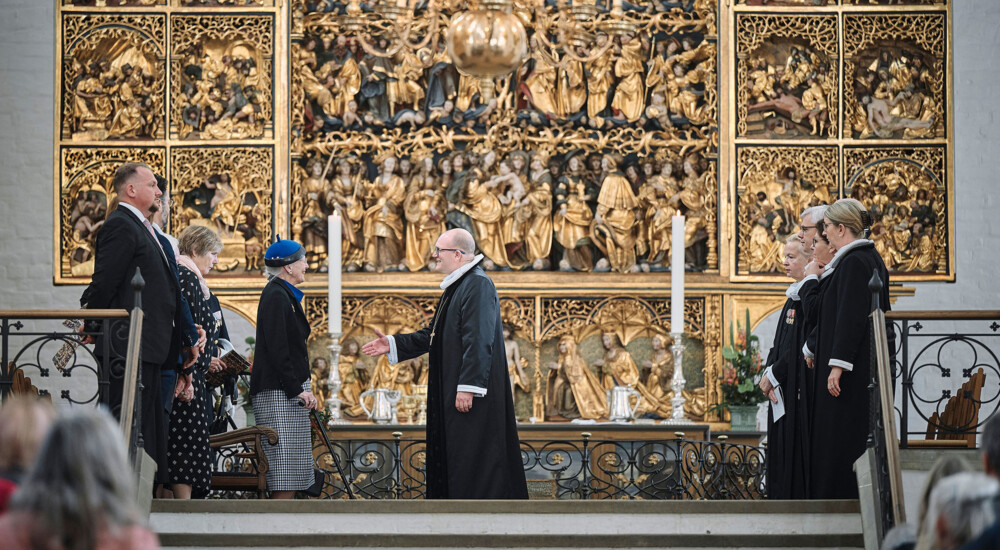 Biskop Mads Davidsen lyser velsignelsen over H.M Dronningen og resten af menigheden foran den 500 år gamle altertavle.