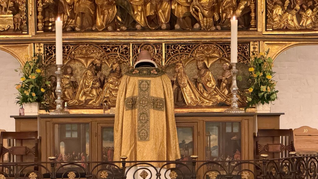 Biskop Mads Davidsen foran Claus Bergs smukke altertavle.