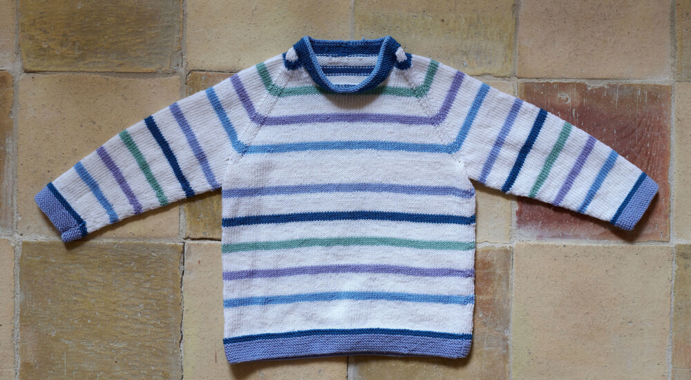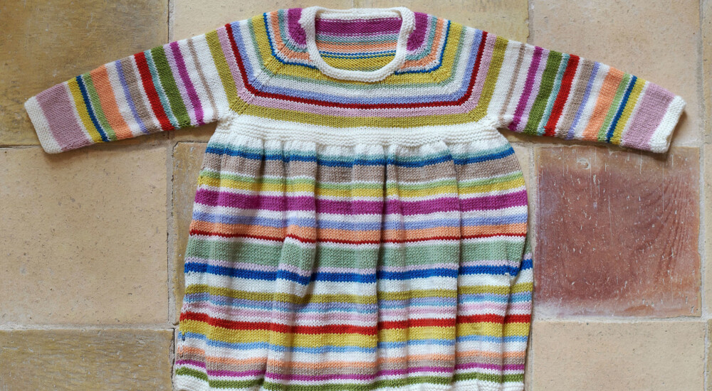 En sød og sjov dåbskjole og dåbssweater med rig mulighed for at freestyle på designet. Designet er inspireret af min datters perleplader og er en variation over striber. Helt simpelt, og så stærkt. Strik en klassisk version eller gå amok med farverne.