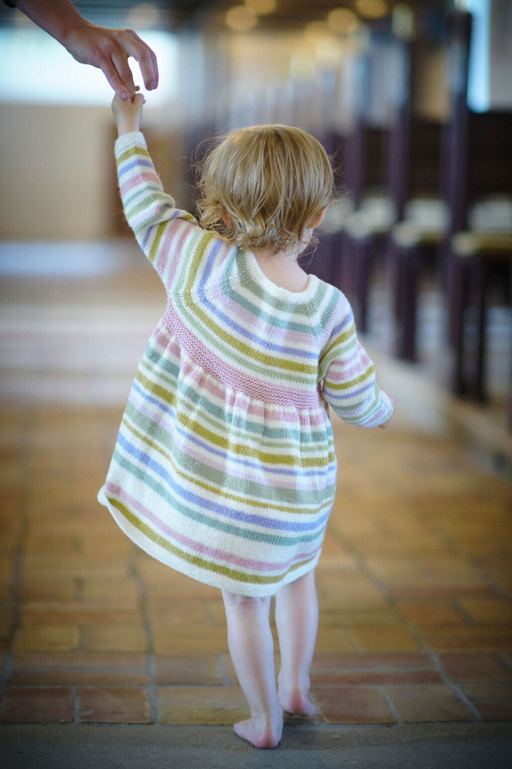 Du kan skrue op og ned for udtrykket. Lav striber i alle farver, eller begræns dig til dine 5 yndlings. Arbejd med toner og nuancer der ligger tæt på hinanden, eller giv den fuld gas med kontrastfarver. Bundfarven er hvid som på klassiske dåbskjoler, og ønsker du en mere klassisk kjole eller sweater, så strik striber i forskellige hvide nuancer og kvaliteter. Strik efter rytme, fx striber på 4 eller 6 omgange eller strik helt uden rytme og nyd friheden.