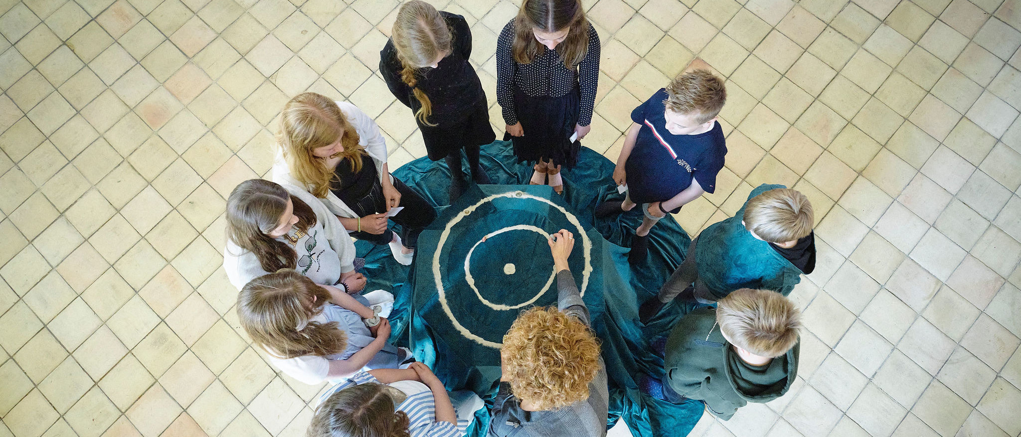 Vi lægger vægt på læringsformer, hvor eleverne udtrykker sig kreativt i ord og billeder, deltager i en workshop, hvor de skal sætte krop på filosofiske temaer eller kommer på en sansevandring i kirkerummet. Vores forløb inddrager litteratur, fortælling, musik, billedkunst – alt sammen forskellige perspektiver på menneskelivet.