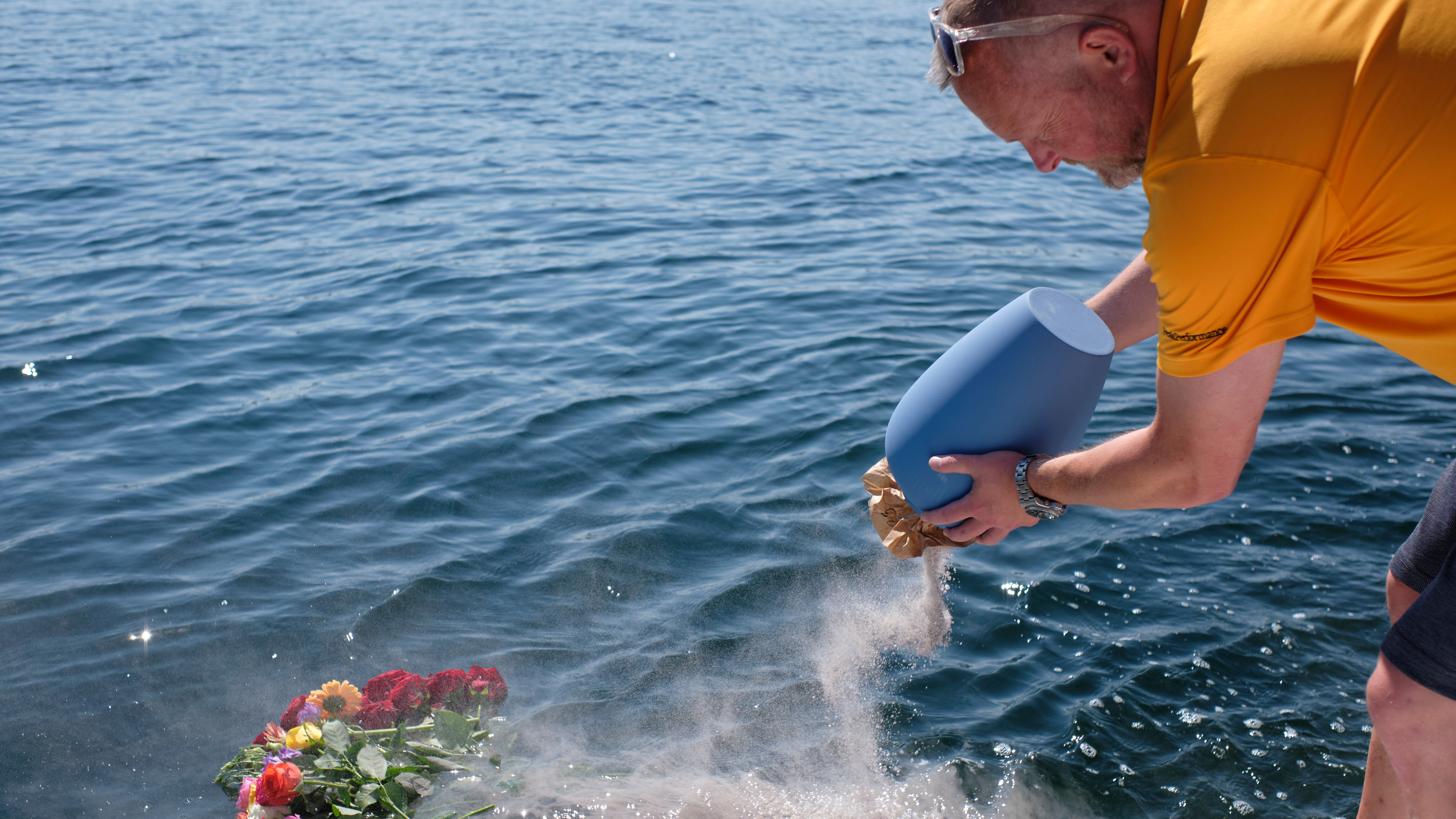 ”Aske ser faktisk ikke så pænt ud i vandet, men det gør blomster, så da vi havde tømt urnen, smed vi blomsterne ud, og så sad på vi på skibet en halv times tid, hvor vi mindedes min onkel og drak en kold øl,” fortæller Morten Dalmose.
