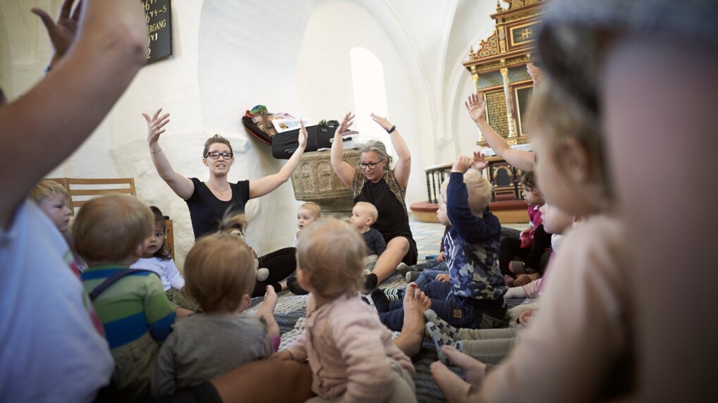 16 børn under tre år har sat sig til rette på et stort tæppe på gulvet helt oppe ved døbefonten i Rolfsted Kirke på Midtfyn. De ved godt, hvad der venter, for de har allerede været her to gange før sammen med deres dagplejere. Fra det øjeblik musikpædagog Kristina Hedelius-Stikkertsen slår på sin xylofon har hun børnenes fulde opmærksomhed.
