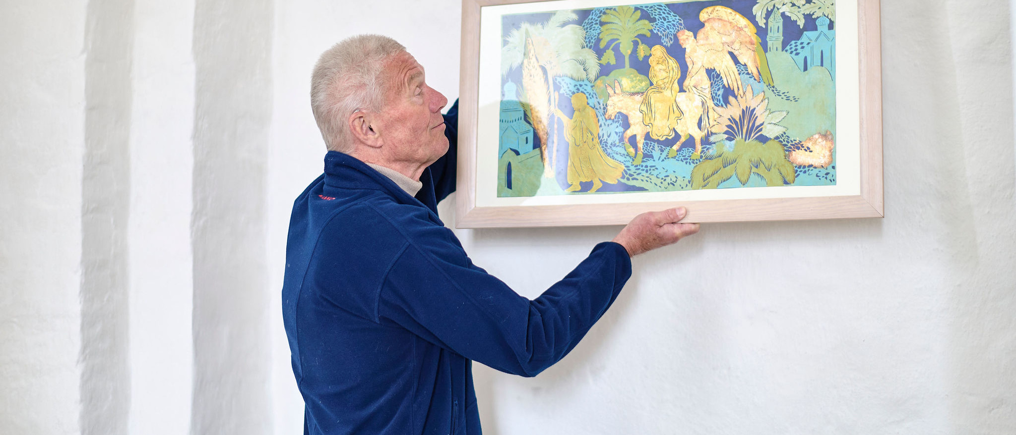 ”I den protestantiske kirke er vi meget talende, men her vil vi også gerne vise billeder. Billeder er jo på en eller anden måde følelser, og vi vil gerne have, at man kommer til at føle noget i forbindelse med kirkerummet,” siger menighedsrådsformanden, som selv er kunstner og også har udstillet i kirken.