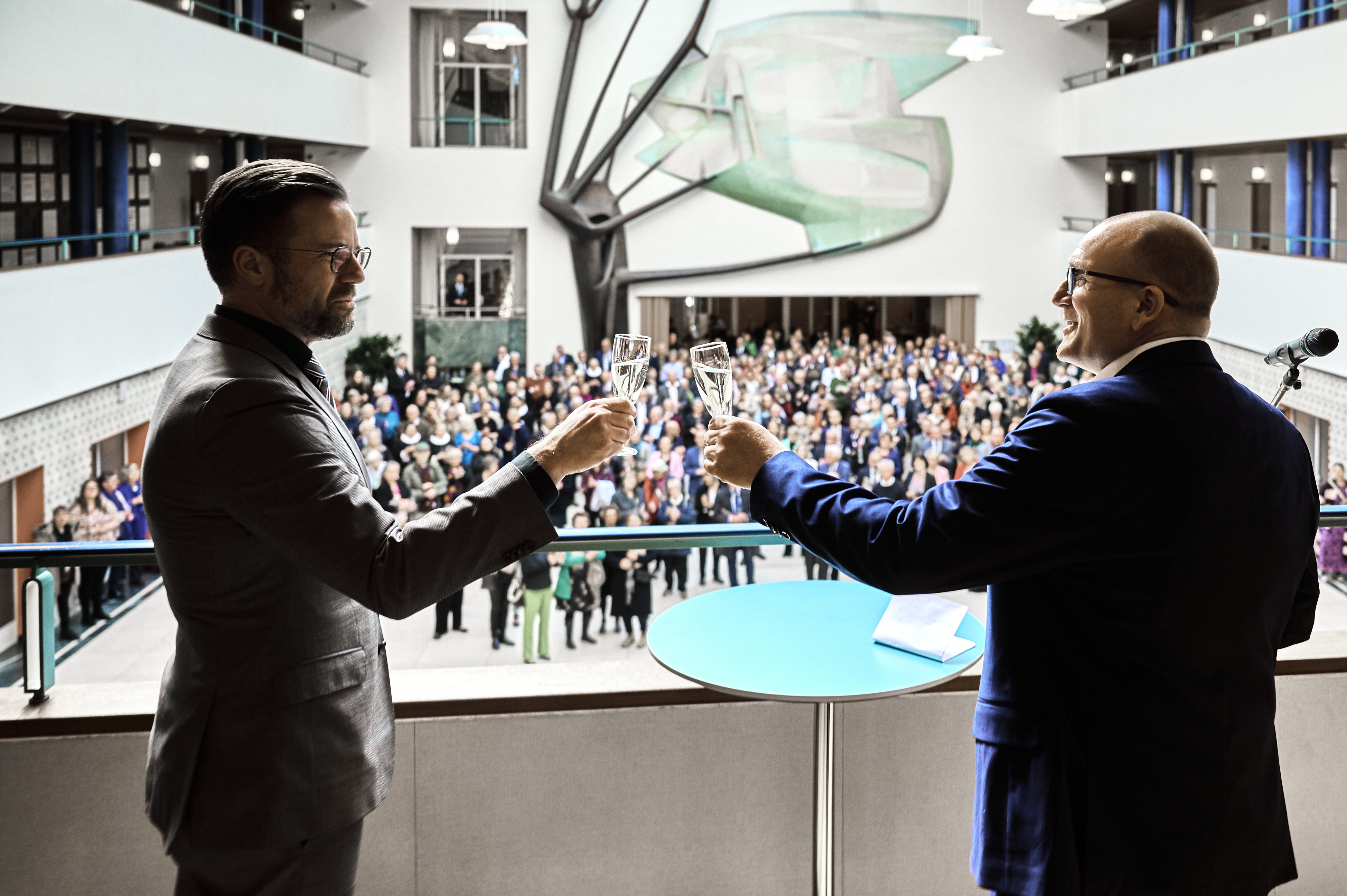 Borgmester Peter Rahbæk Juhl og biskop Mads Davidsen skåler