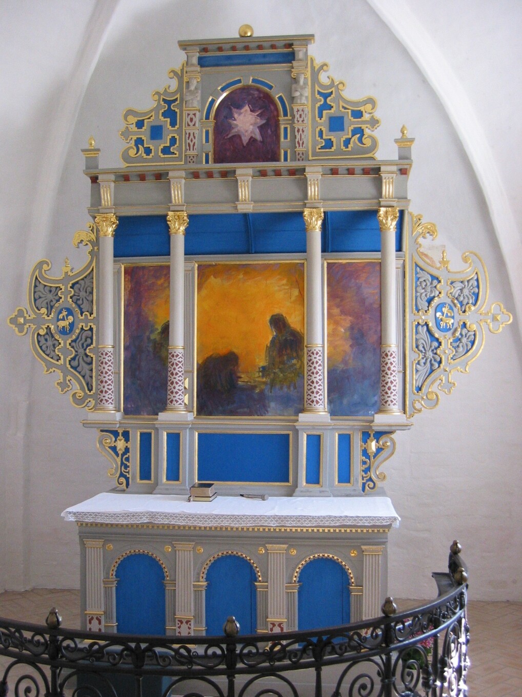Temaet for altertavlens maleri er fortællingen om de to disciple, der efter Jesu død vandrer mod Emmaus, hvor de møder en person, som de om aftnen indbyder til at blive hos dem. ”Og mens han sad til bords sammen med dem, tog han brødet, velsignede og brød det og gav dem det. Da åbnedes deres øjne, og de genkendte ham; men så blev han usynlig for dem” (Luk 24, 30-31).