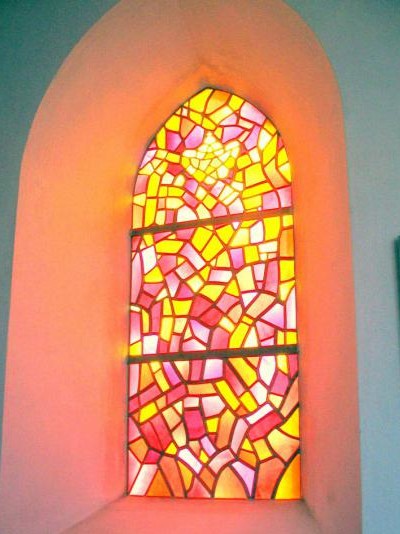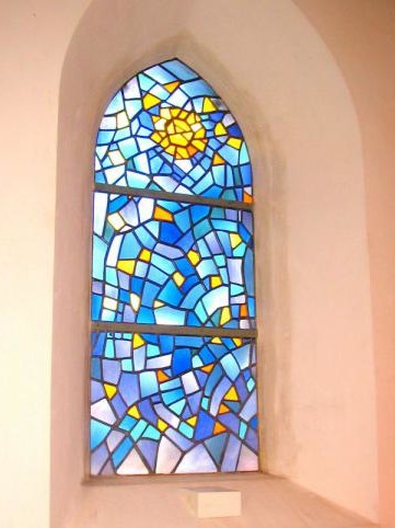 De to store, smukke glasmosaikker er placeret i henholdsvis skibets nord- og sydside.
