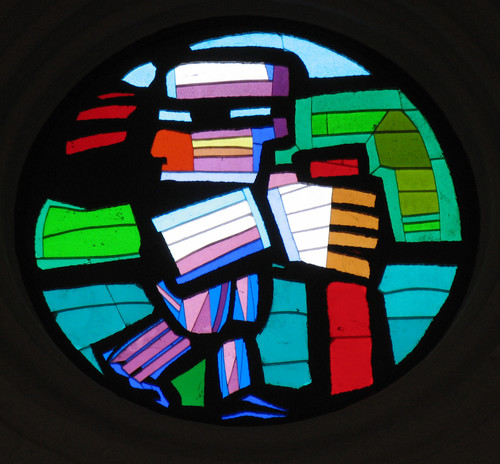 Den smukke, farverige glasmosaik er opsat i et rundt vindue i kirkens nordside i forbindelse med kirkens 700 års jubilæum.
