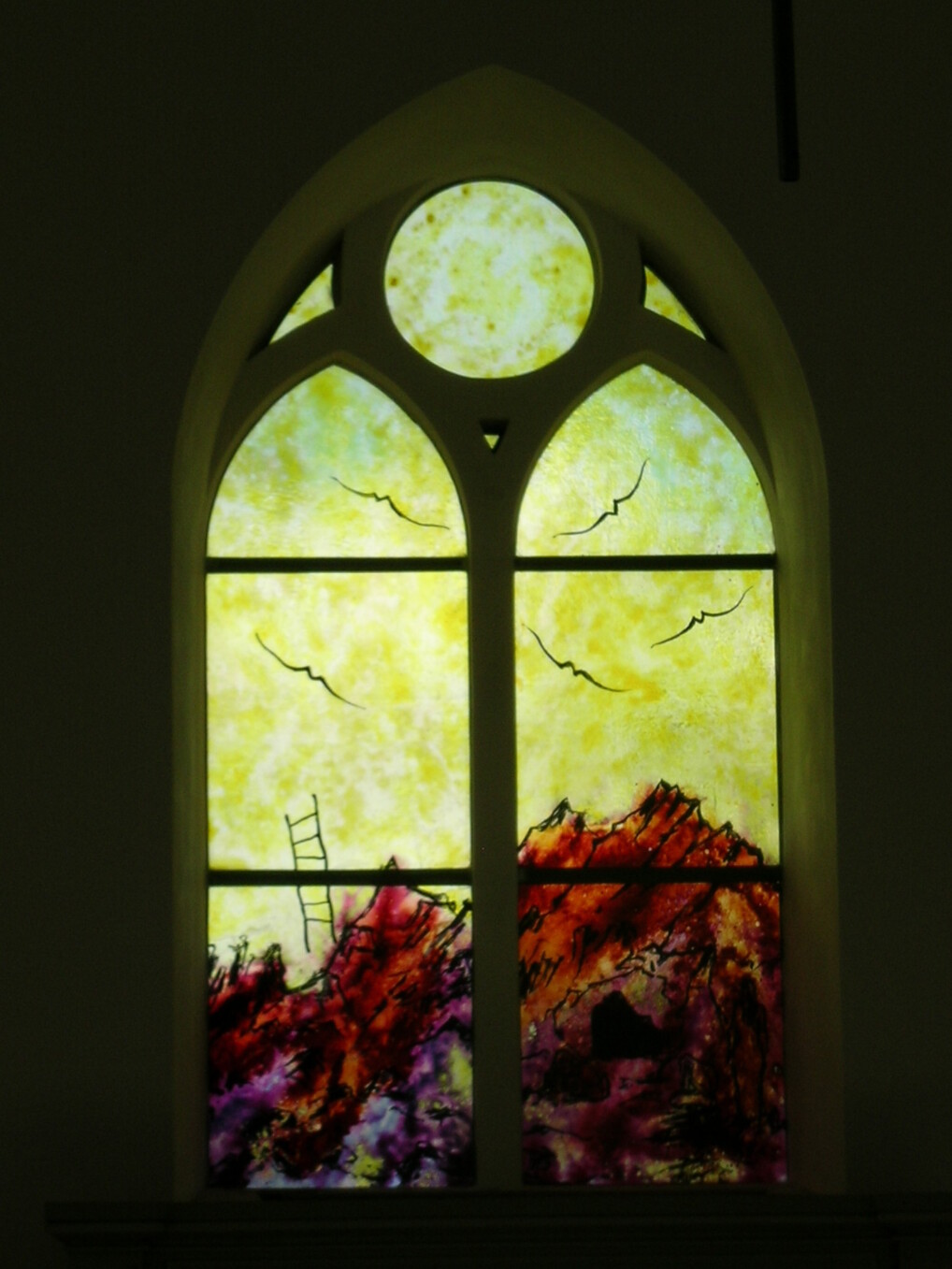 I hvert af dem er der indsat tredelte glasmalerier af den færøske kunstner Tròndur Patursson. Det er billeder med stærke fortællinger.