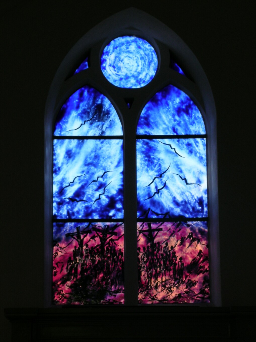 I den nordlige korsarm ses Golgatascenen udført I blå og røde nuance, mens scenen mod syd viser Opstandelsen udført i gyldne farver.