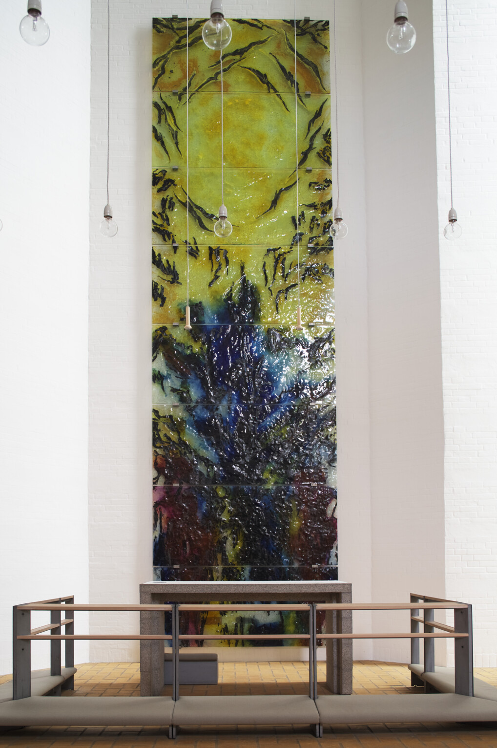 Tornbjerg kirke, der stod færdigbygget i 1994, fik i år 2000 opsat en imponerende altertavle. Det er en 8 m høj og 2 m bred bemalet glasvæg, hvis stærke farver beriges af det transparente glas, der tillader kirkerummets hvide bagvæg at skinne igennem.