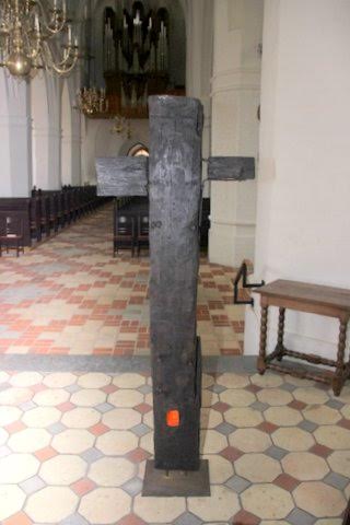 Korsstelen er udført i egetræ med jern, søm, farvepigment og bivoks.