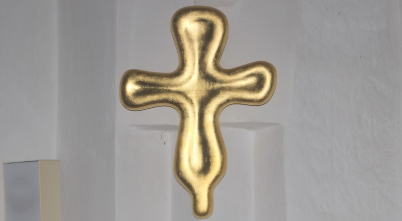 Det ca. 60 cm. høje forgyldte vægkors i bløde former er ophængt på triumfvæggen ved døbefonden.