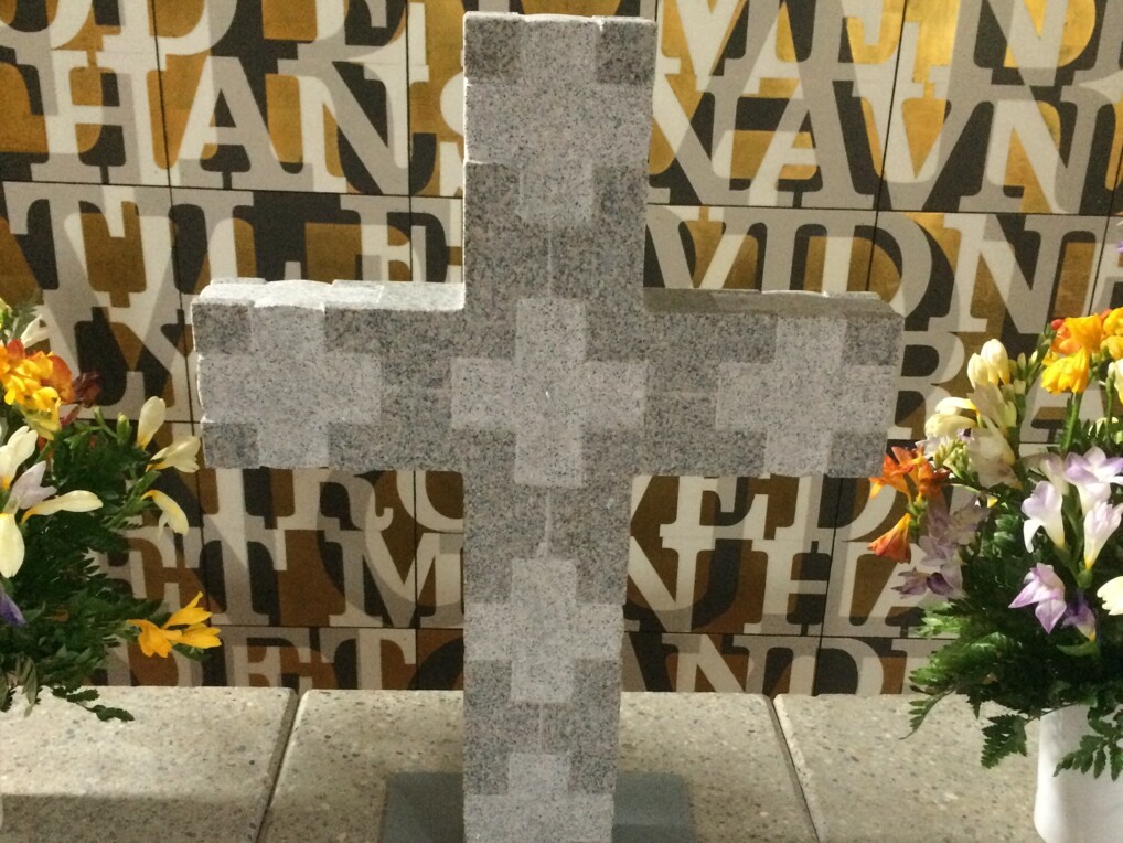 Korset på alteret er udført i granit. Det er 68 cm højt. Det er udsmykket med seks lysere, fordybede kvadratkors.