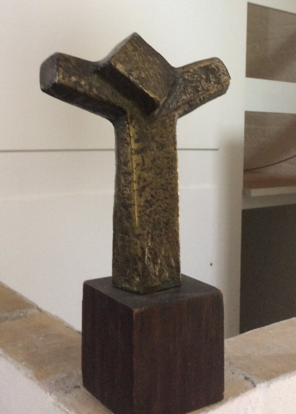 Det er udført i et enkelt, geometrisk formsprog som en figur med udstrakte arme og hovedet hvilende på højre skulder.