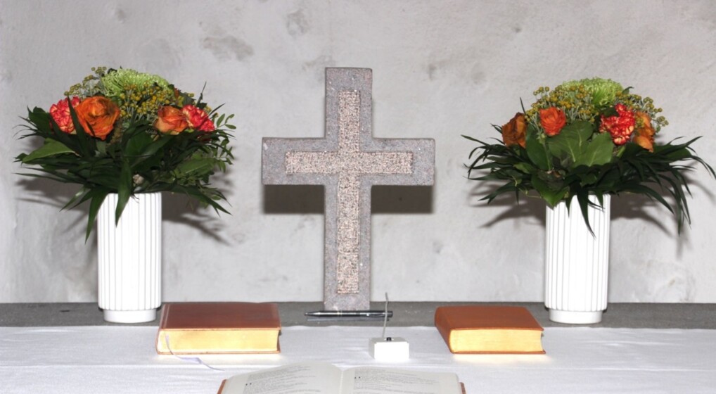 Et lille enkelt granitkors, der passer fint i stil med kirkens alter fra 1958.