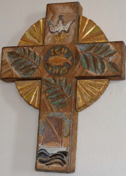 I midten af korset en fisk og kristusmonogrammet ICHTHYS – det græske ord for fisk.