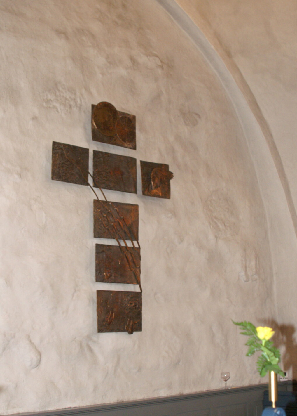 I korset ses en række dyrefodaftryk, der viser dyrene, (livet) på vej op imod en lysende sol (Gud), men de mødes af en vandstrøm, (Helligånden) som strømmer ned fra det høje ledsaget af en due.