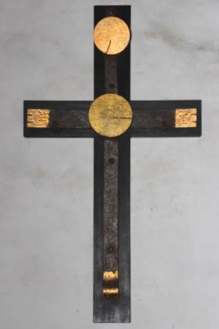 Vægkorset, der hænger på den nordre væg i skibet, er lavet af frasorteret palisandertræ på en jernramme af skrotjern og dekoreret med gamle hængsler der er belagt med bladguld.