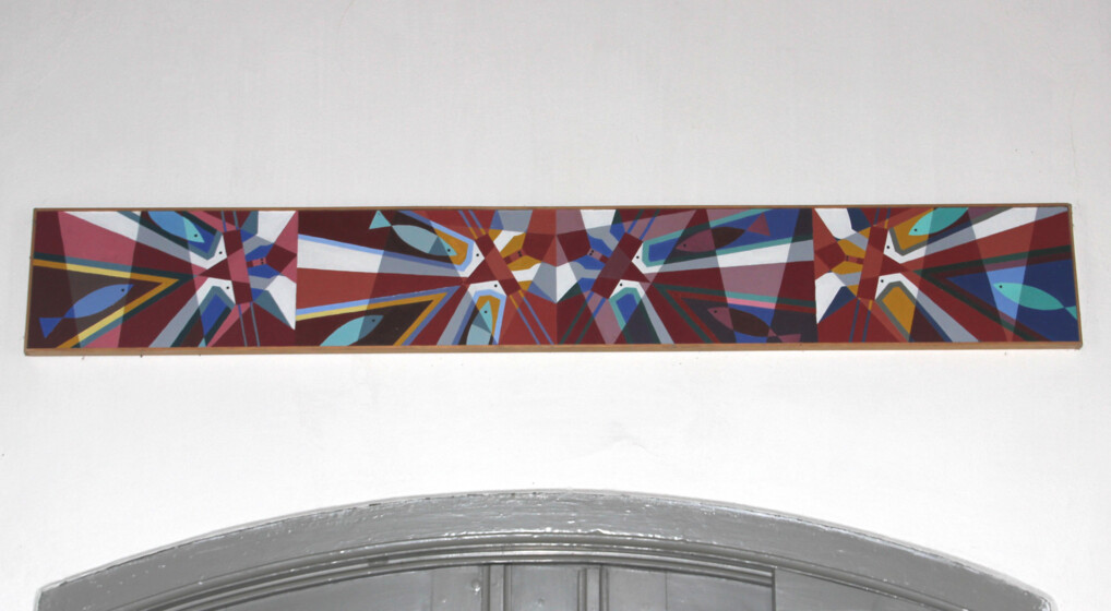 Billedet, der hænger over våbenhusets indgangsdør, er et moderne maleri, hvor man ser mange fisk og enkelte fugle.