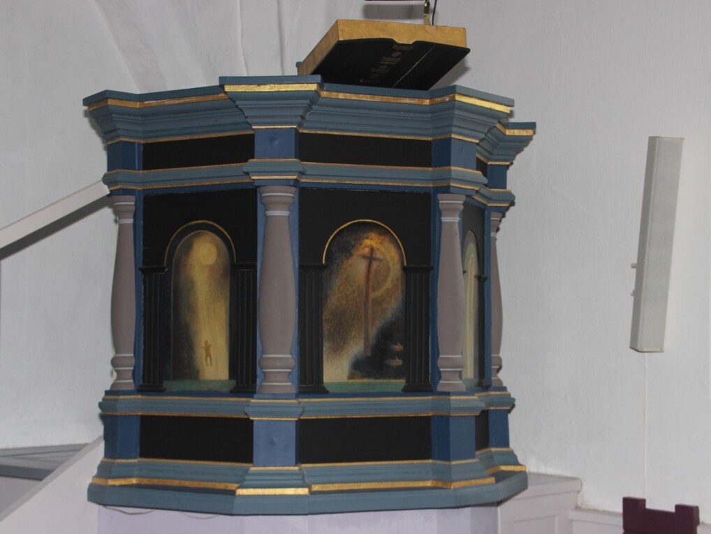 I 1993 blev kirkens prædikestol fra 1800 tallet restaureret, og i den forbindelse fik de 4 felter nye billeder malet af Poul Lee.