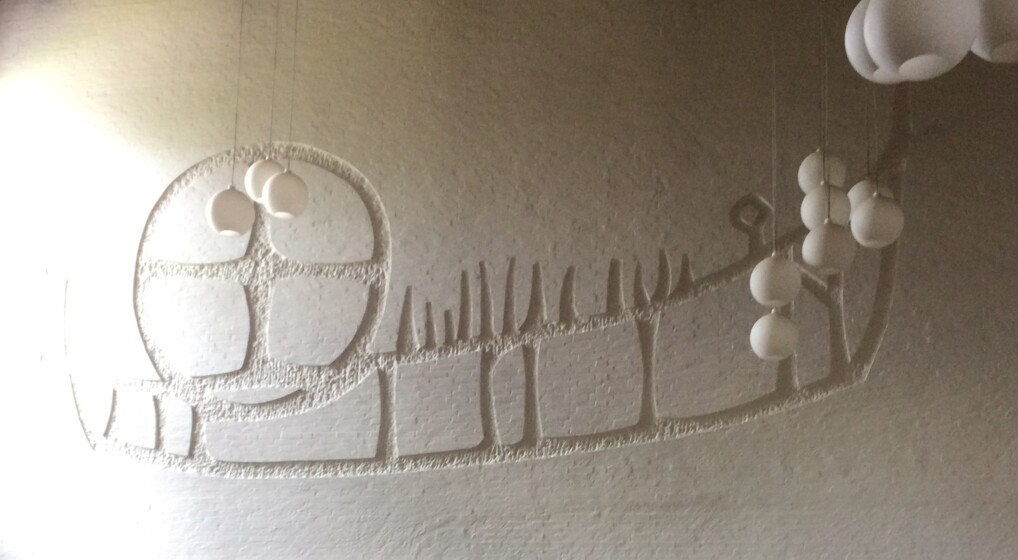 På kirkens hvidkalkede korvæg mod øst har kunstneren hugget en stor helleristning i form af et skib. Værket bærer titlen ”Skibet der sejlede kristendommen til Norden”.