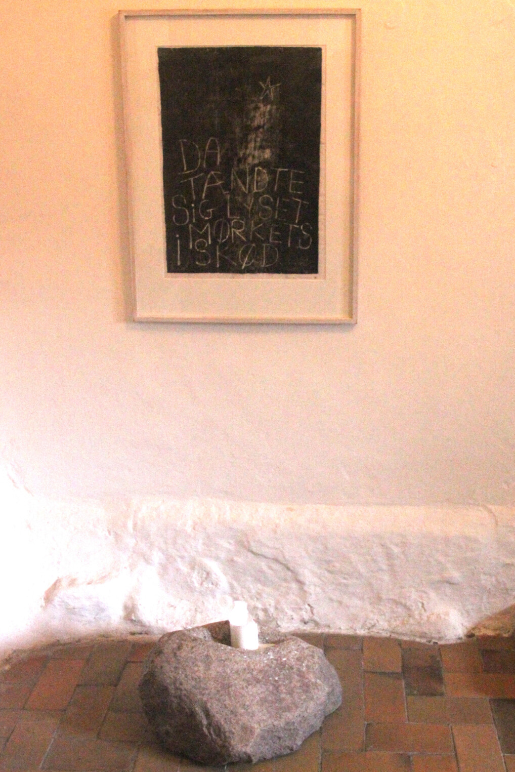 I våbenhuset hænger et træsnit med teksten ”Da tændte sig lyset i mørkets skød”.