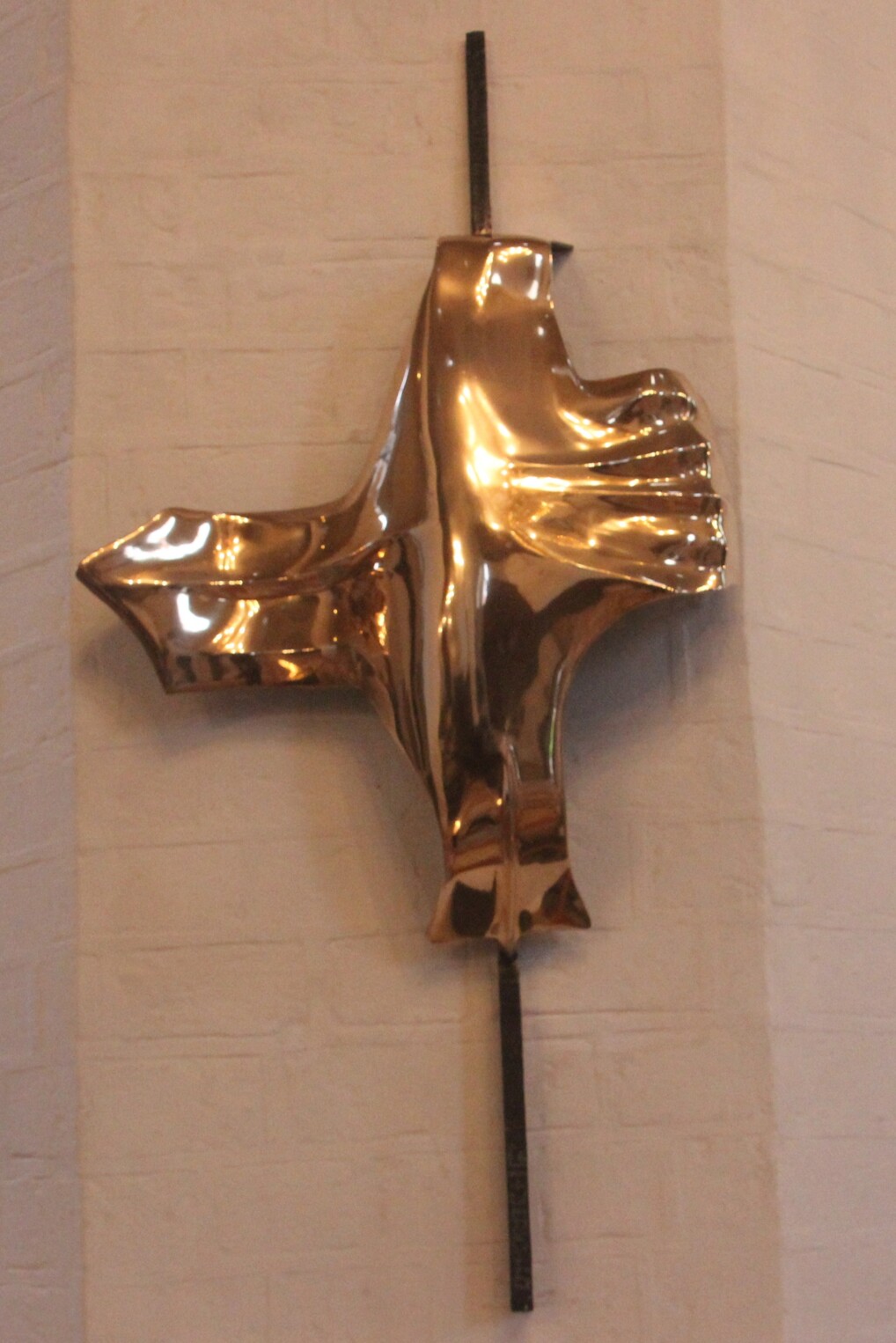 Kunstværket hænger på en søjle i nærheden af døbefonden.