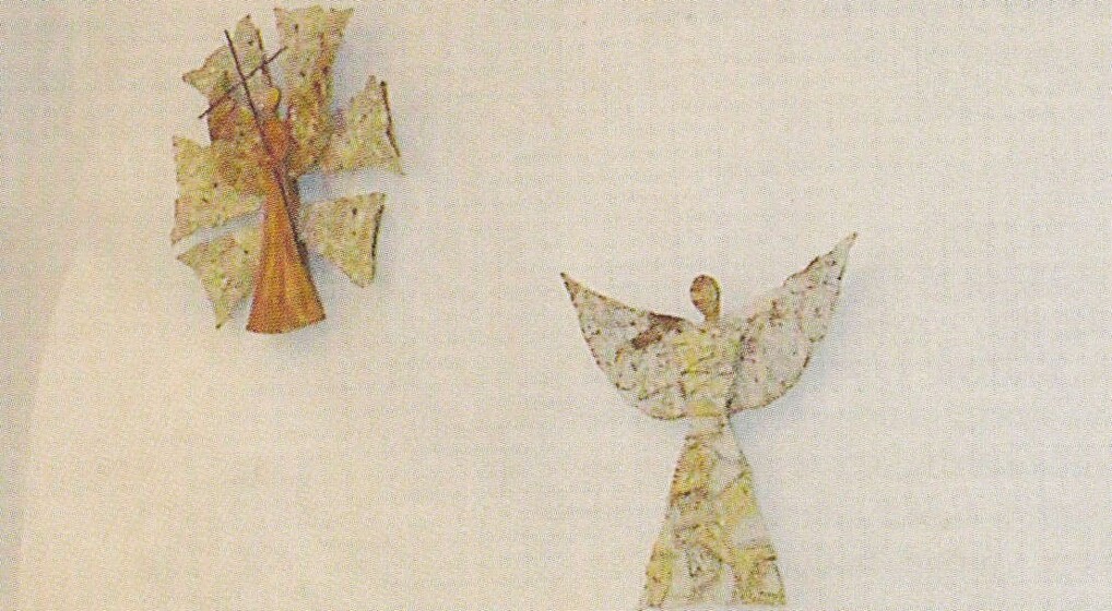 De to keramik engle hænger i kirkerummet over indgangsdøren.