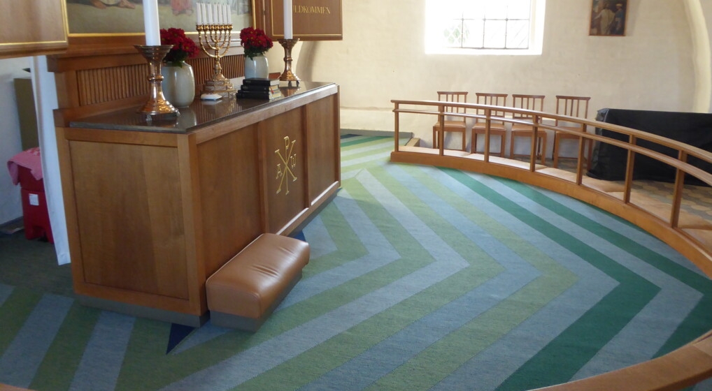 Altertæppet i Åsum kirke er håndvævet af den fynske kunstner Jette Nevers i 1992.