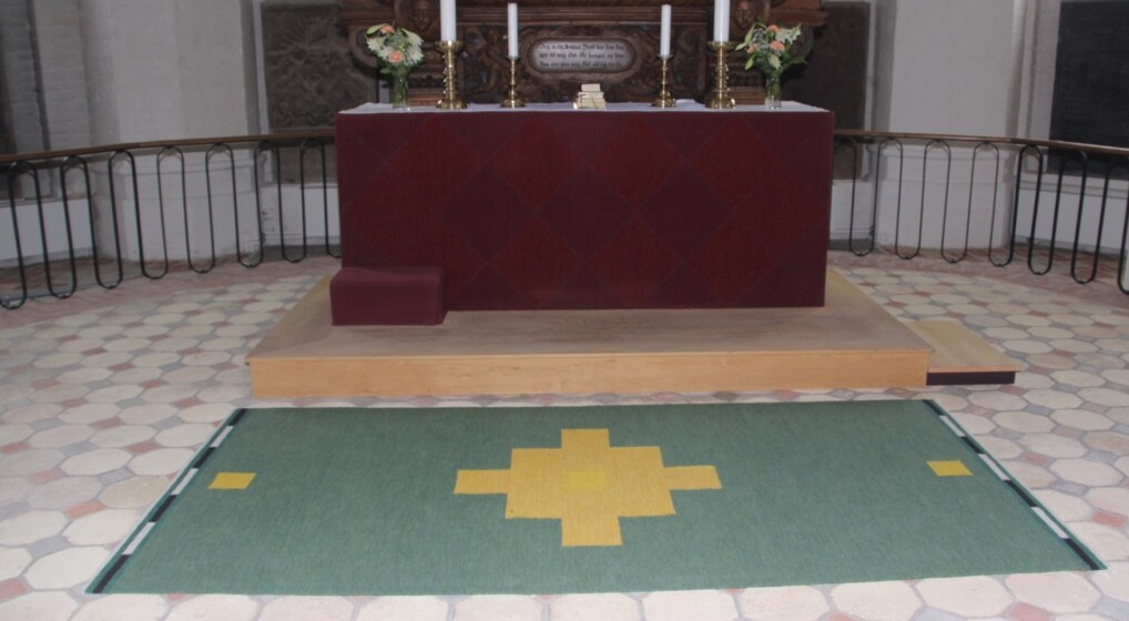 Altertæppet er et løst tæppe i en grøn farve med et ”korslignende” centerparti”