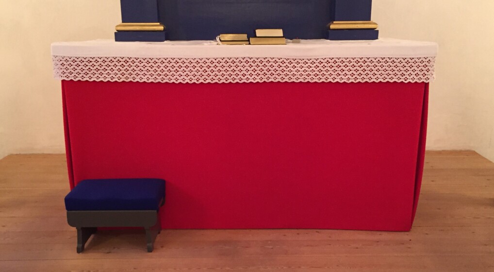 Antependiet, er maskinvævet i en meget klar rød farve, og det er fremstillet på Jaksland Pude-Hynde-Polsterfabrik i Holbæk.