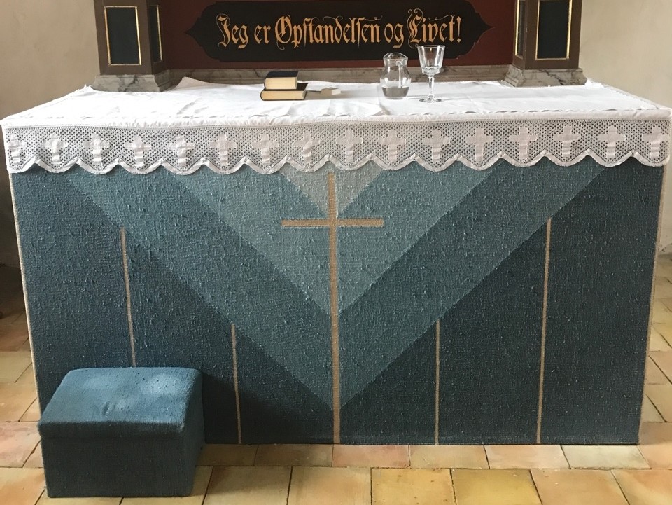 Antependiet i Bovense kirke er udført af væveren Anne Mette Birch i blå farver med et kors indvævet i midten.
