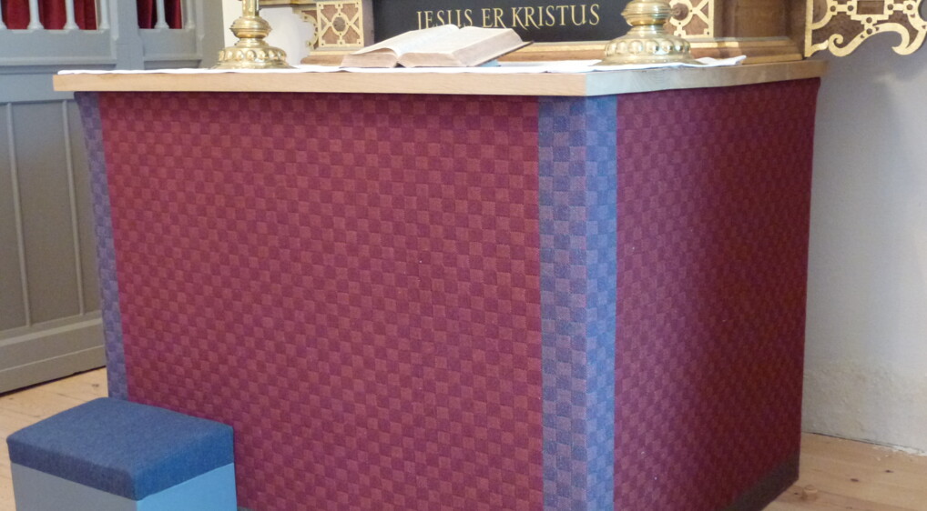 Antependiet er vævet i kvadrater i blå og violette farver af Hanne Vedel, Spindegaarden, Aabenraa