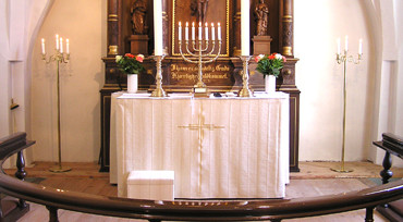 Antependium vævet i stribeeffekt i en råhvid farve og et guldkors udført i maskinbroderi.