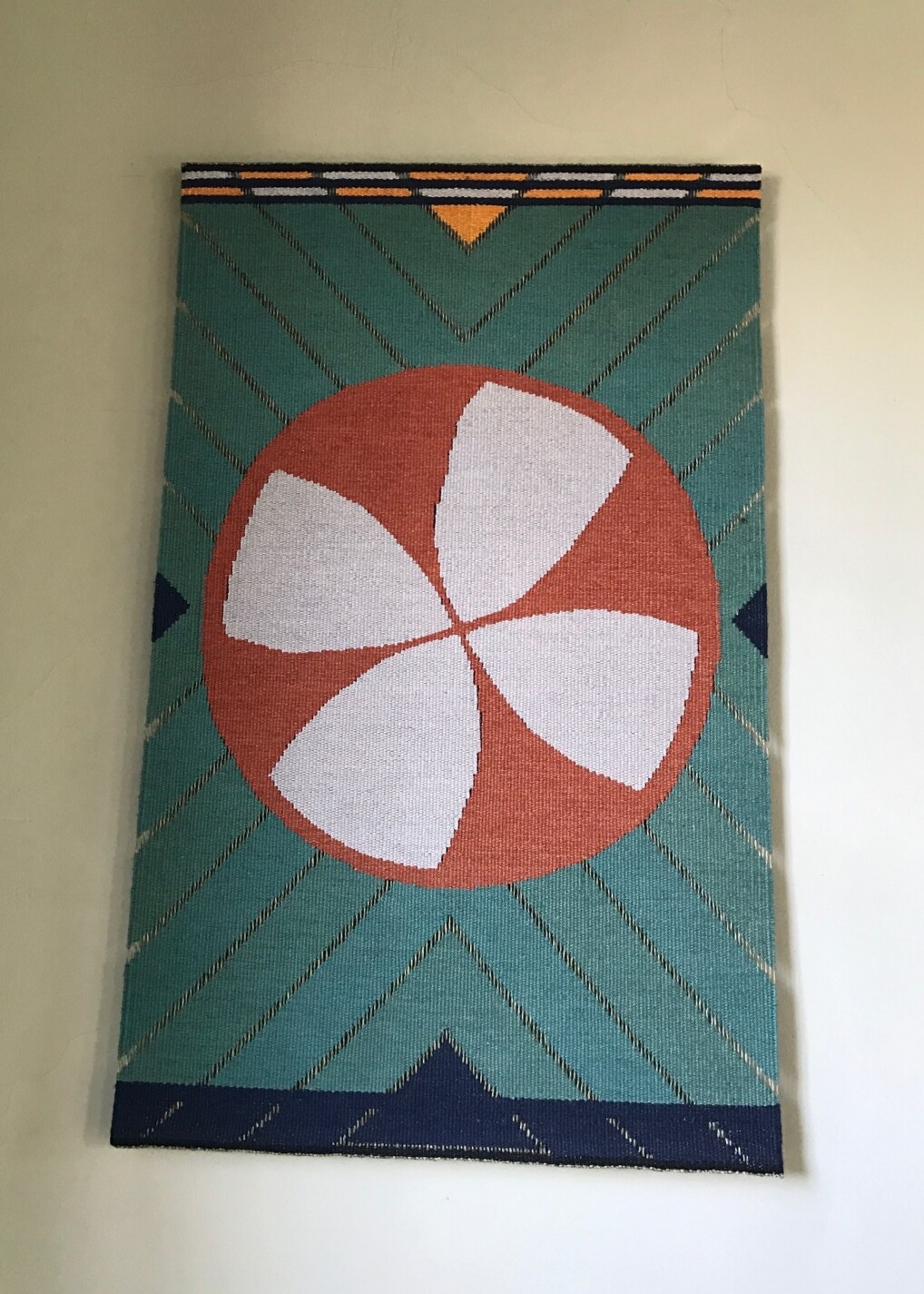 Tæppet er vævet i grønne nuancer og i midten en stor hvid roset på rød bund.