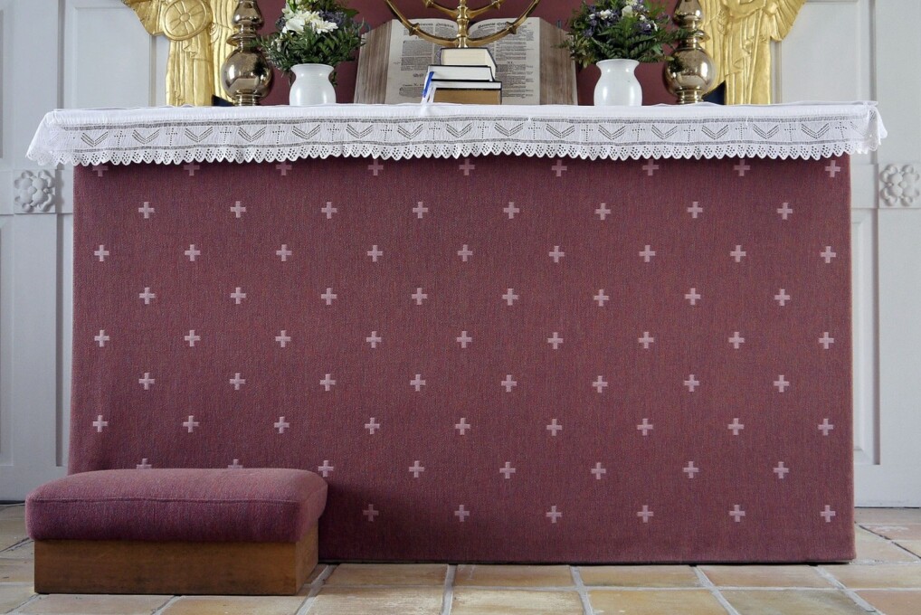 Antependiet er vævet i en lillarød farve med et mønster af lyse røde små "kors”.