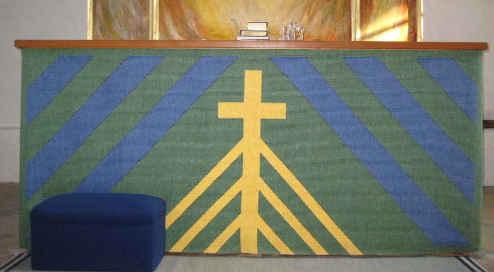 Antependium indgår med sit næsten lysende kors og sin stramme komposition fornemt i alterets helhedsbillede.
